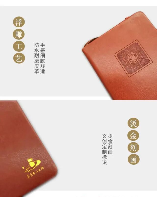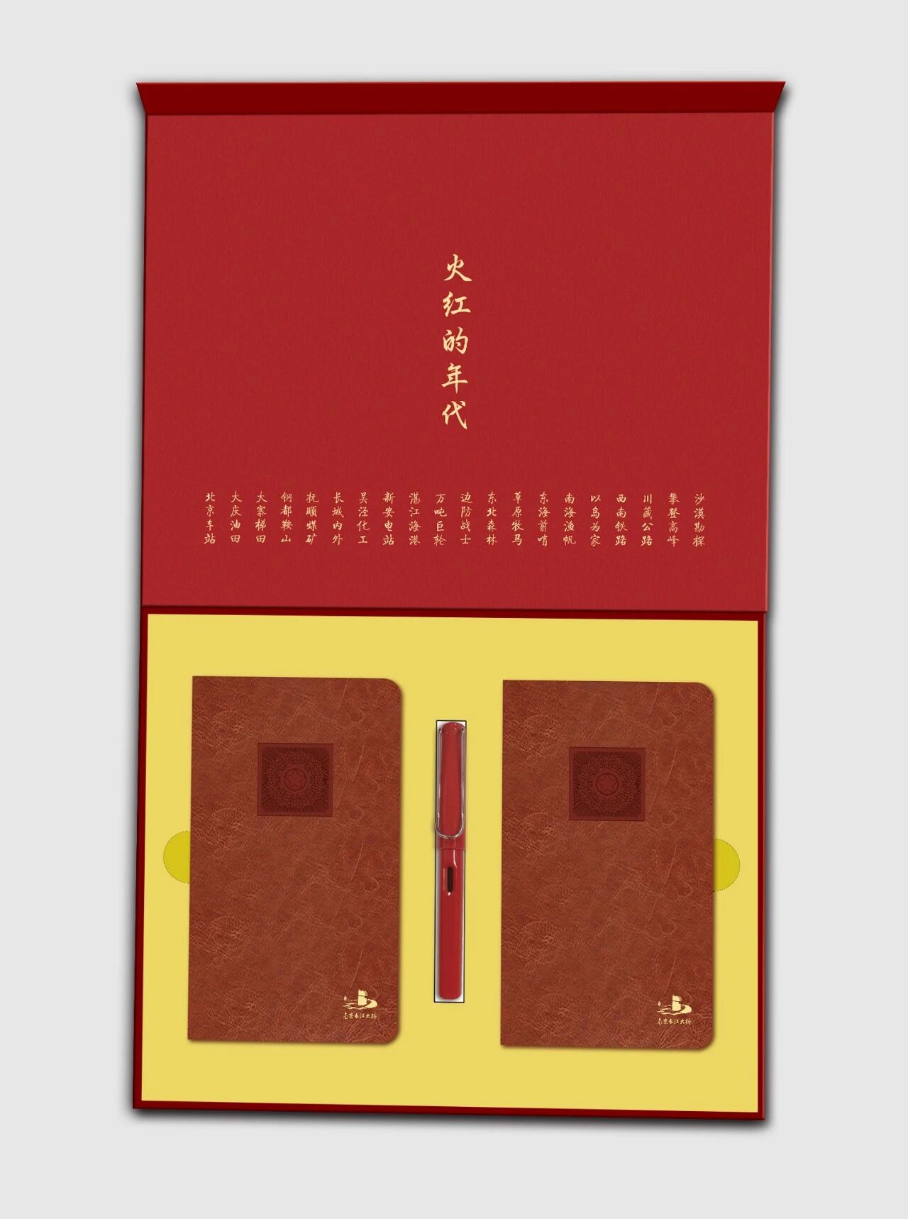 文创笔记本以轻巧便携为设计导向,采用20幅浮雕画中的代表性图像,如“草原牧马”“万吨巨轮”“长城内外”等,以版画彩绘风格呈现,色彩明快,富有张力。封面采用浮雕和烫金工艺,金色线条在光线下熠熠生辉,象征着那个火红年代的辉煌与激情,每一本封面如同一枚微缩的浮雕,让人仿佛将大桥栏杆上的风景握于掌中。