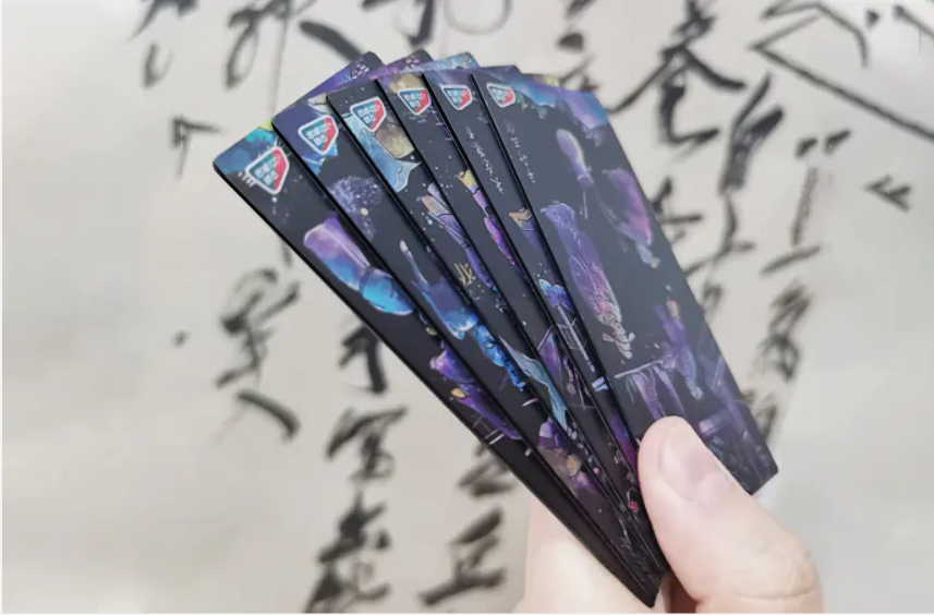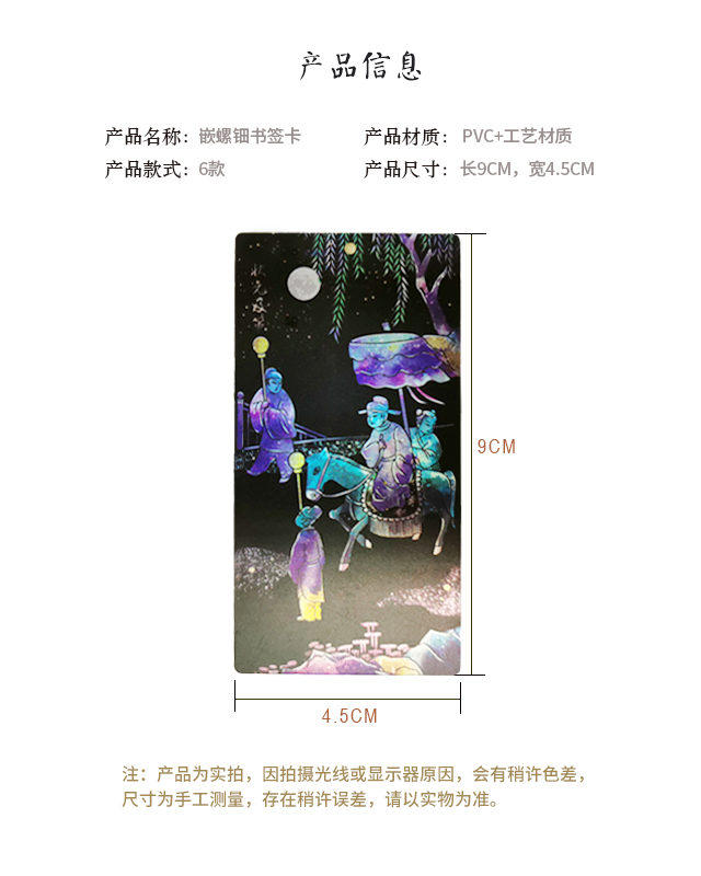 非遗工艺的现代转译:通过研发设计,以现代精密工艺在书签卡上逼真模仿出 “嵌螺钿” 的视觉效果。图案绚丽多彩,光泽流转,生动复现了传统漆器上螺钿“天生丽质”的质感,让非遗美学触手可及。