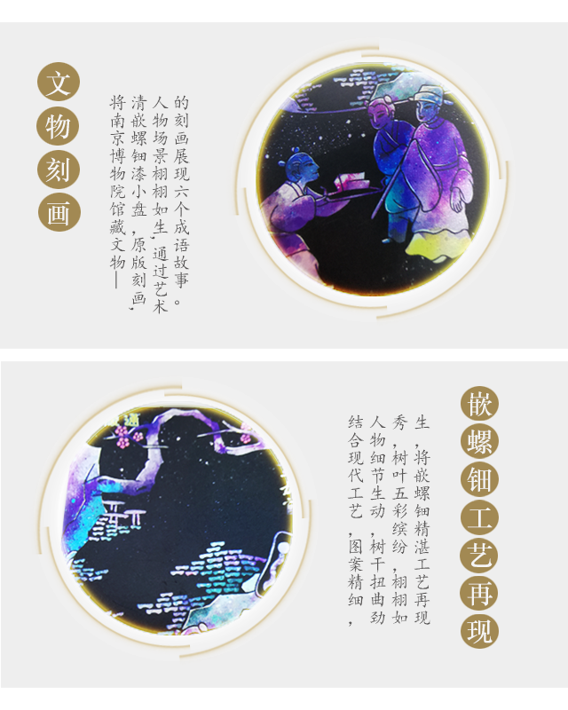 方寸之间,镶嵌大千世界。嵌螺钿是中国传统的装饰工艺,以天然螺壳与海贝磨制出的薄片,镶嵌出绚丽多彩的图案,极具艺术感染力。本系列产品正是对这一瑰宝技艺的致敬与创新演绎。