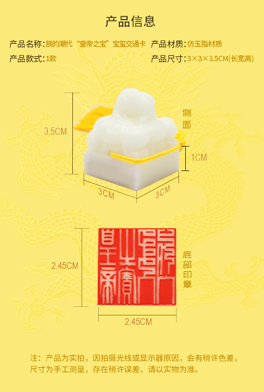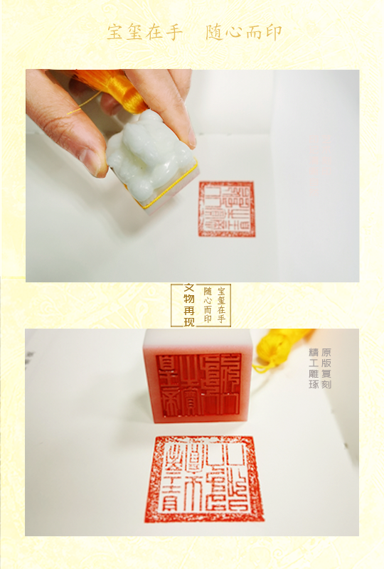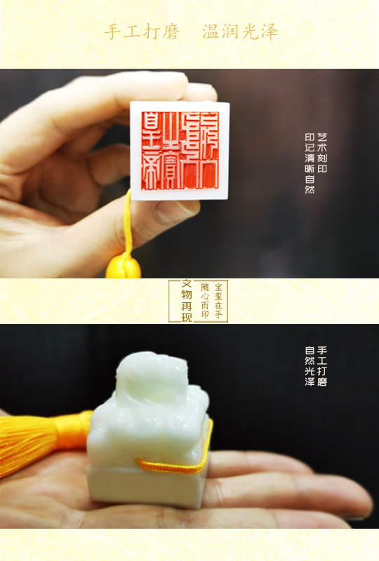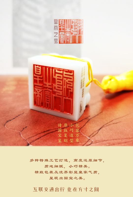 温润如玉,精工典藏:创新采用高级仿玉脂材质,手感温润细腻,色泽通透。盘龙钮等细节雕刻到位,兼具玉的雅致与宝玺的庄严,是一款可握于掌中的微型艺术品。