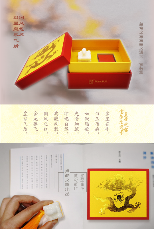 乐趣倍增,创意体验:随卡附赠专属挂饰与印泥,您可随时为书信、笔记钤盖“皇帝之宝”,轻松享受乾隆同款“御批”快乐,让文创互动融入生活。产品设计巧妙,可乘车、可装饰,趣味十足。