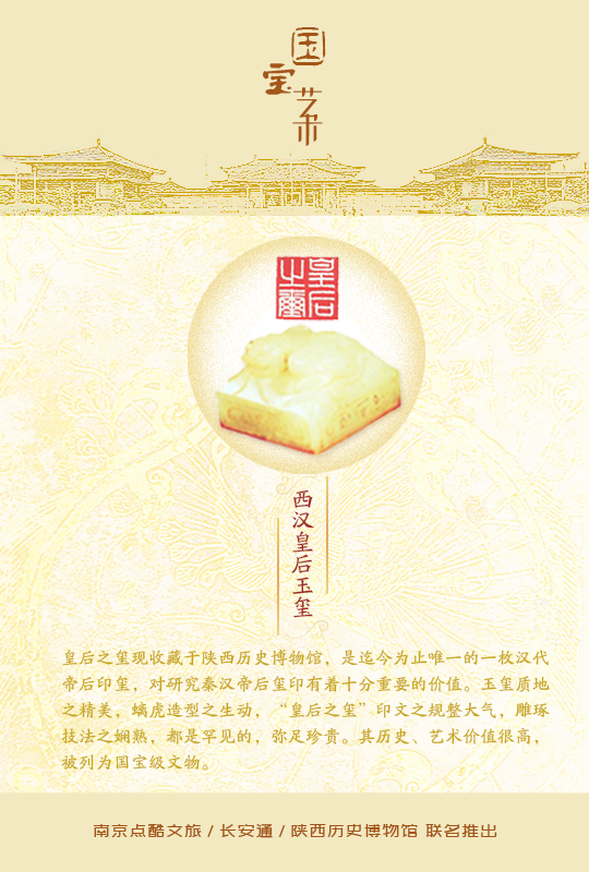 本品以陕西历史博物馆镇馆之宝——汉代皇后玉玺为蓝本,采用现代尖端工艺立体复刻的中国首款“凤权信物”交通卡。以温润仿羊脂白玉材质,精准再现螭虎盘钮的威仪与云纹流转的哲思,将两千年前未央宫中的至高权柄,转化为一枚可畅行全国、随手钤印的现代通行符节,完成一次从吕后掌政到数字时代的文明对话。