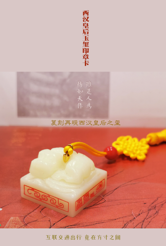 这枚交通卡,封印着大汉的基因。原型乃迄今发现*早的帝后印信,和田羊脂白玉雕琢,螭虎钮威中藏柔,或许曾属传奇吕后,执掌未央风云,见证文景之治。我们并非制作一张卡片,而是在重启一段历史。