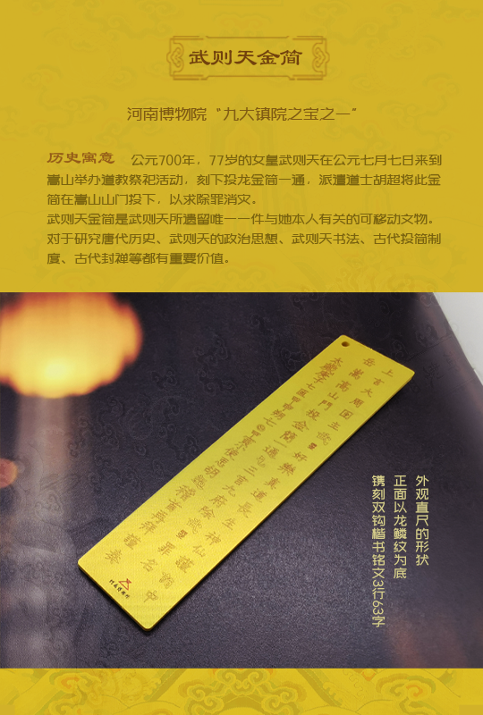 文字再现:以现代精雕工艺,细致还原金简上双钩阴刻的62字篆书铭文,特别是“武曌”(武则天自称)二字,让女帝的手书印记触手可及,方寸之间尽显文物的书法之美与历史信息。
