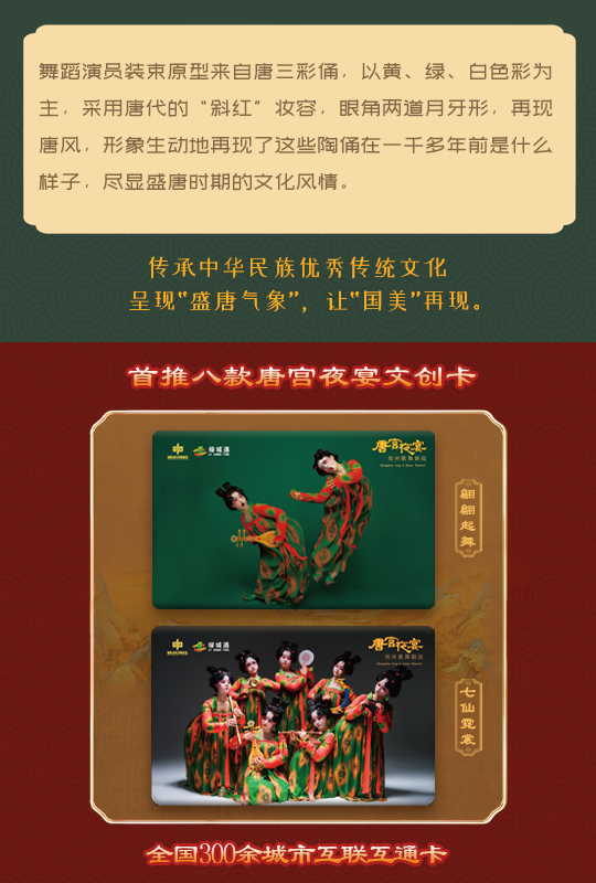 《唐宫夜宴》交通卡是一款以现象级舞蹈《唐宫夜宴》中俏皮灵动的“唐宫小姐姐”形象为核心,融合盛唐美学设计的文化创意交通卡。卡面设计源于唐三彩乐舞俑的妆容与服饰,再现了唐代仕女的丰腴体态与诙谐神韵,卡背则饰以传世名画《簪花仕女图》局部,将动态舞姿与静态画意相结合。产品旨在将辉煌灿烂的盛唐气象凝于方寸之间,让持卡用户在日常出行中,能随时随地感受与触碰中华**传统文化的魅力。