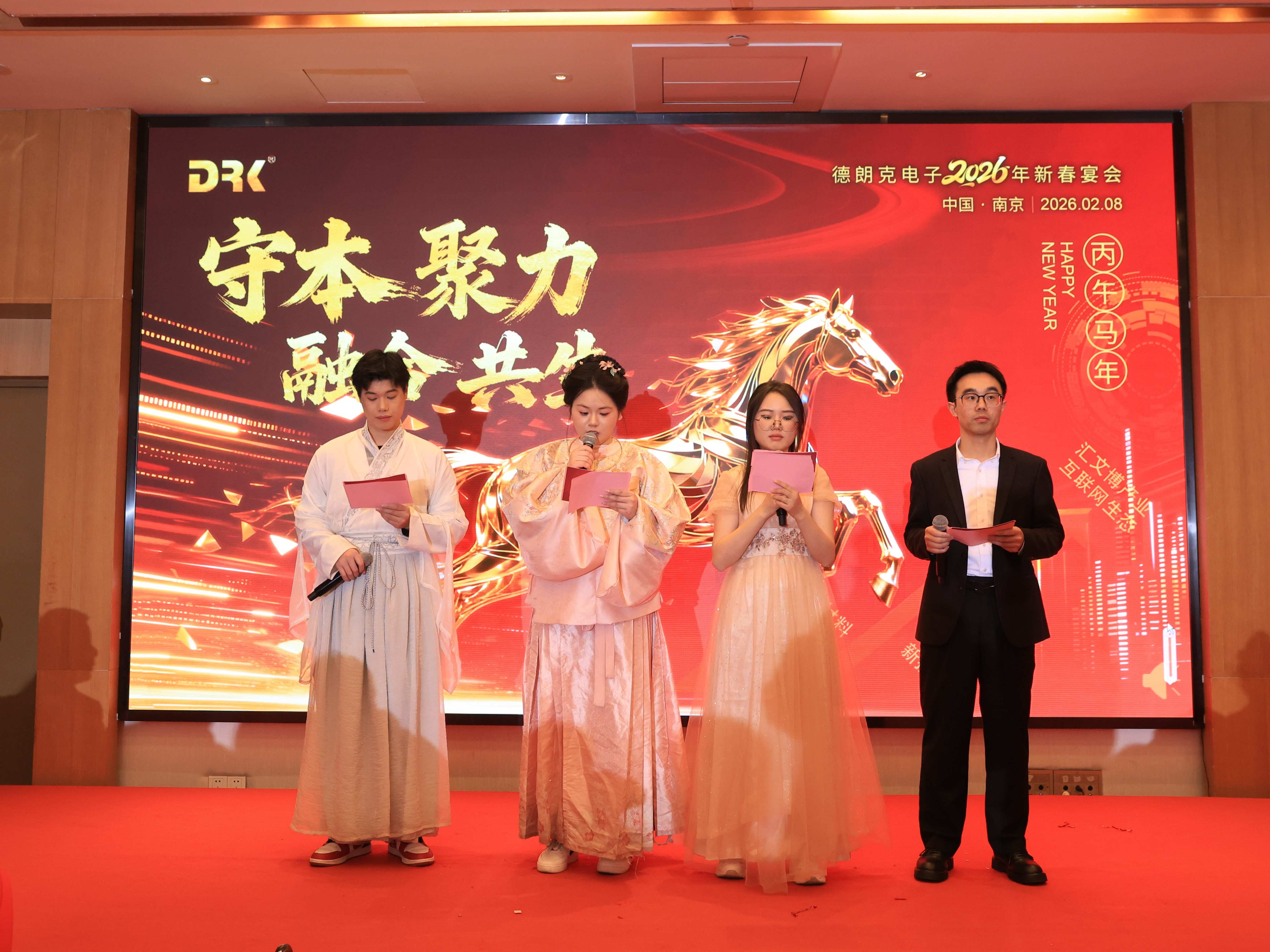 2026年2月8日晚,南京德朗克电子科技有限公司“守本聚力,融合共生”主题新春晚宴温情启幕。晚会伊始,主持人以深情的话语诠释了年会主题的深刻内涵:“守本”,是十五载对匠心与品质的深沉守望;“聚力”,是面对挑战时紧握彼此的信任与动力;“融合”,是文化、技术与模式的跨界创新;“共生”,是与客户、伙伴乃至时代共成长的庄严承诺。这八个字,不仅照亮了当晚的会场,更凝聚了德朗克电子人共同的信念与追求。